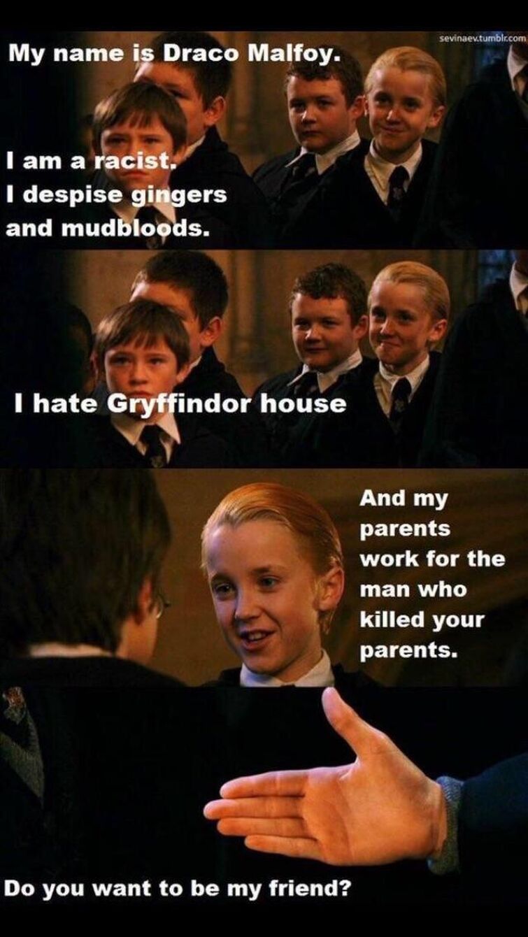 10 Hilarious Draco Harry Memes ScreenRant January 24 2021 admin 0 Comments No matter how much the Harry Potter novels placed the titular protagonist and Draco Malfoy at odds with each other fans like. And you can bet that all of them make an appearance in the following 63 funny memes. Read Im Malfoy Draco Malfoy from the story Harry Potter memes by japjyotdosanjh japjyot with 1649 reads.